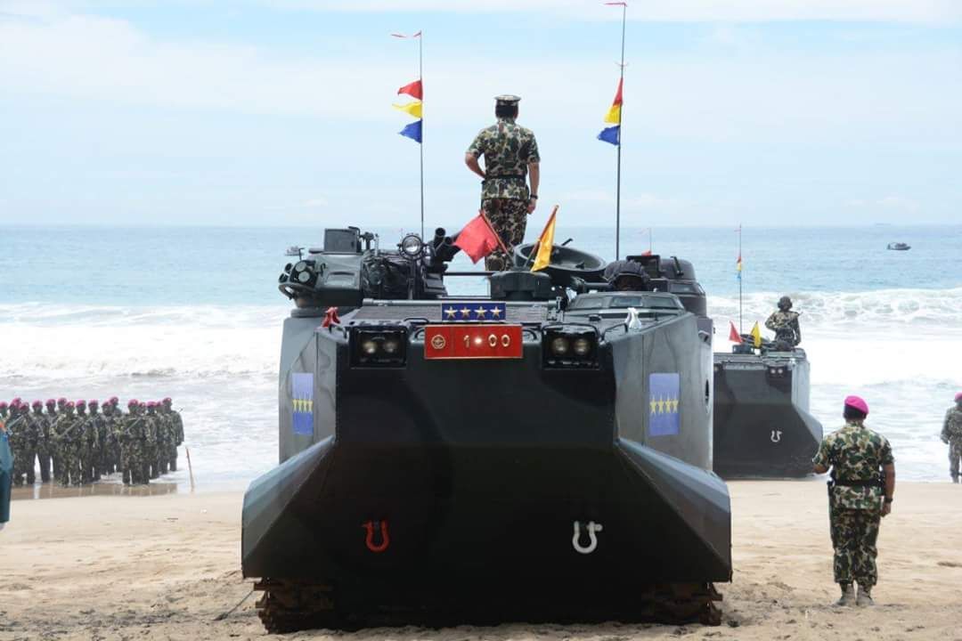 Selanjutnya dengan menggunakan kendaraan tempur Landing Vehicle Tracked 7 (LVT-7) A1, Panglima TNI Marsekal Hadi Tjahjanto di dampingi oleh Komandan Korps Marinir Mayjen TNI (Mar) Bambang Suswantono dan diikuti Tank Amfibi BMP-3F, melaksanakan gerakan tempur taktis Kerja Sama Infanteri Tank (KSIT) dan Penyerbuan Mekanis (Bunis) menuju tempat pengukuhan yang berada di Pantai Nganteb, Kabupaten Malang bersama prajurit Regu Pandu Tempur (Rupanpur) Brigif-1 Marinir.