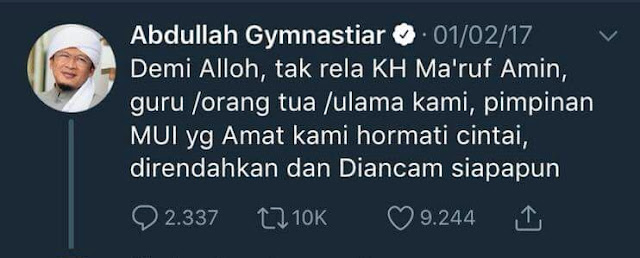 “Demi Allah, tak rela KH Ma’ruf Amin, guru/orang tua/ulama kami, pimpinan MUI yang amat kami hormati cintai, direndahkan dan diancam siapapun,” tulis Aa’ Gym di akun Twitternya, tahun 2017 lalu. (red/TI)*
