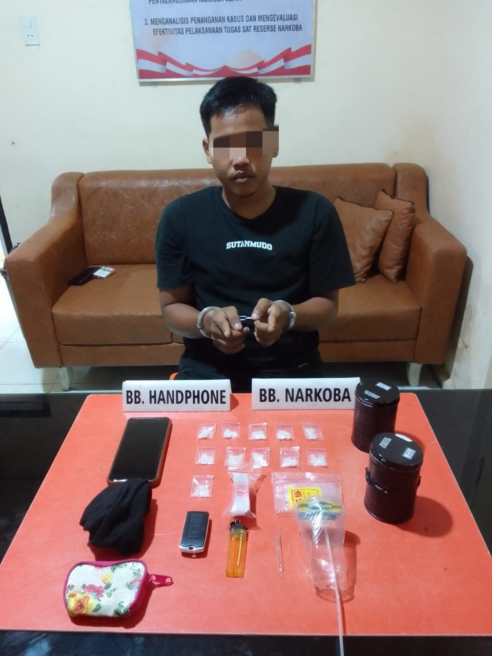 Selanjutnya dilakukan penggeledahan yang disaksikan oleh Perangkat Desa setempat ditemukan 11 (sebelas) paket Narkotika jenis Shabu yang dibungkus dengan plastik bening antara lain 1 (satu) paket Narkotika jenis Shabu ditemukan dilantai kamar dan 10 (sepuluh) paket Narkotika jenis Shabu yang dibungkus dengan plastik bening di balut kain warna hitam ditemukan di dalam kaleng warna hitam.