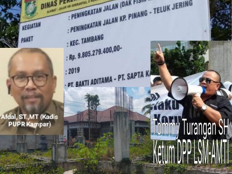 Dimana sebagaimana dikatakan oleh Ketua Umum DPP LSM-AMTI Tommy Turangan SH, bahwa informasi yang didapat oleh tim investigasi LSM-AMTI bahwa diduga oknum Kadis PU-PR Kampar Afdal ST., MT ada permainan atau konspirasi dengan kontraktor dalam pelaksanaan proyek tersebut.