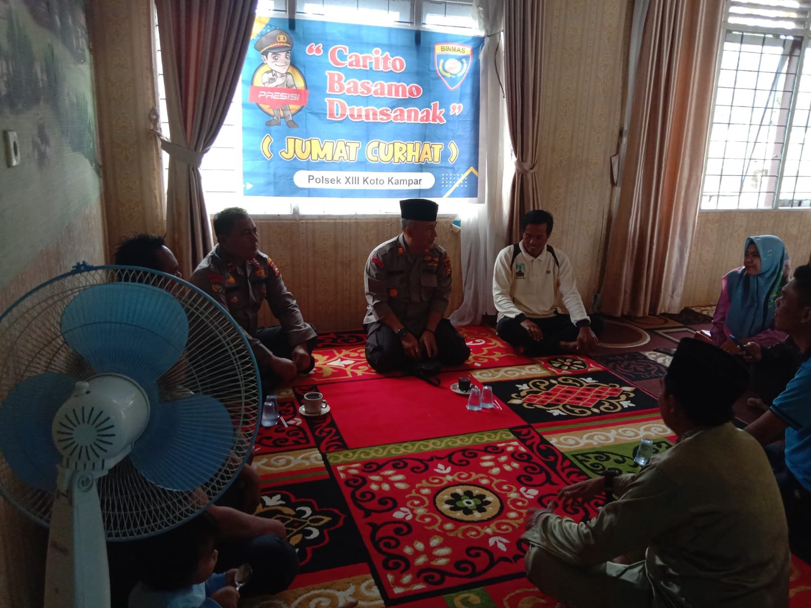 Xlll Koto Kampar, Transparansi indonesia.co.id Jum’at Curhat merupakan program yang dirancangkan oleh Kapolri dalam upaya Polri untuk mewujudkan wadah bagi masyarakat untuk berinteraksi dengan pimpinan maupun anggota Polri di tingkat polda, polres, maupun polsek dalam rangka menyampaikan aduan, kritik, saran dan masukan terkait pelayanan polisi.