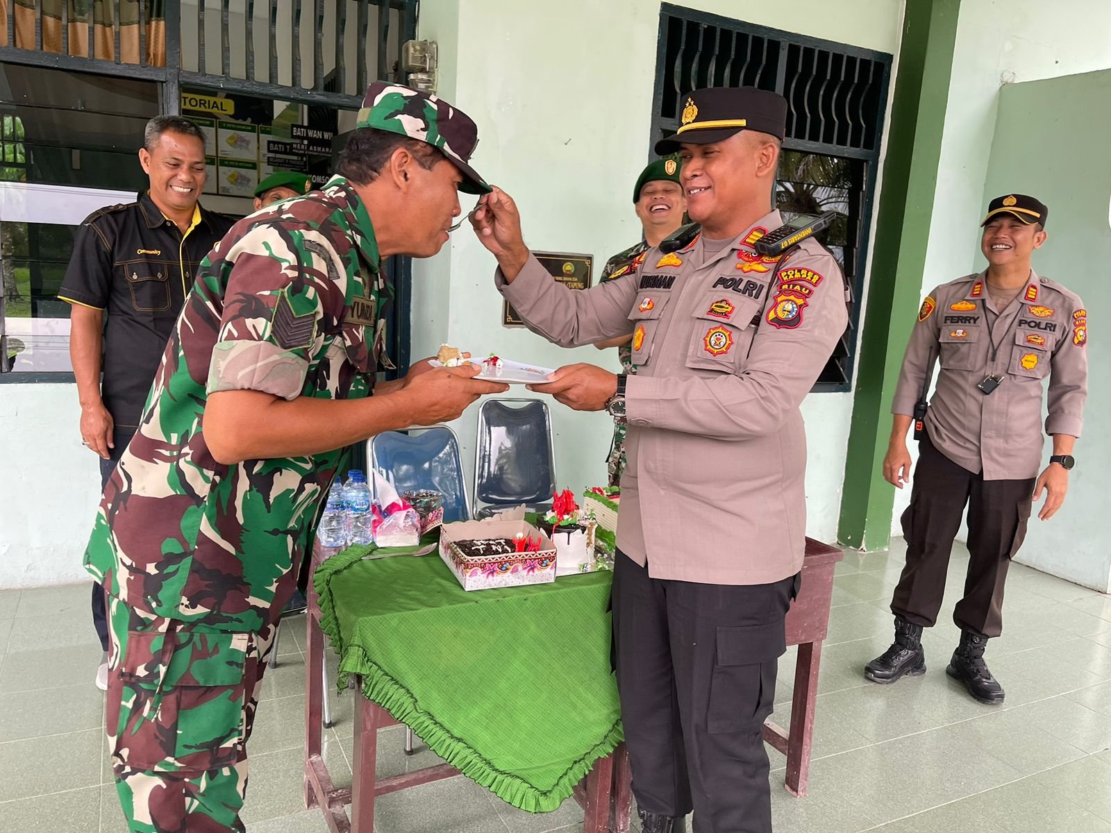 Dalam kesempatan tersebut Plh Kapolsek Tapung AKP Ferry M.Fadilla,SH dan Kapolsek Tapung Hulu AKP Nurman,SH.MH memberikan kue ulang tahun HUT TNI Ke-78 kepada Peltu Supriadi seraya menyanyikan lagu selamat ulang tahun.