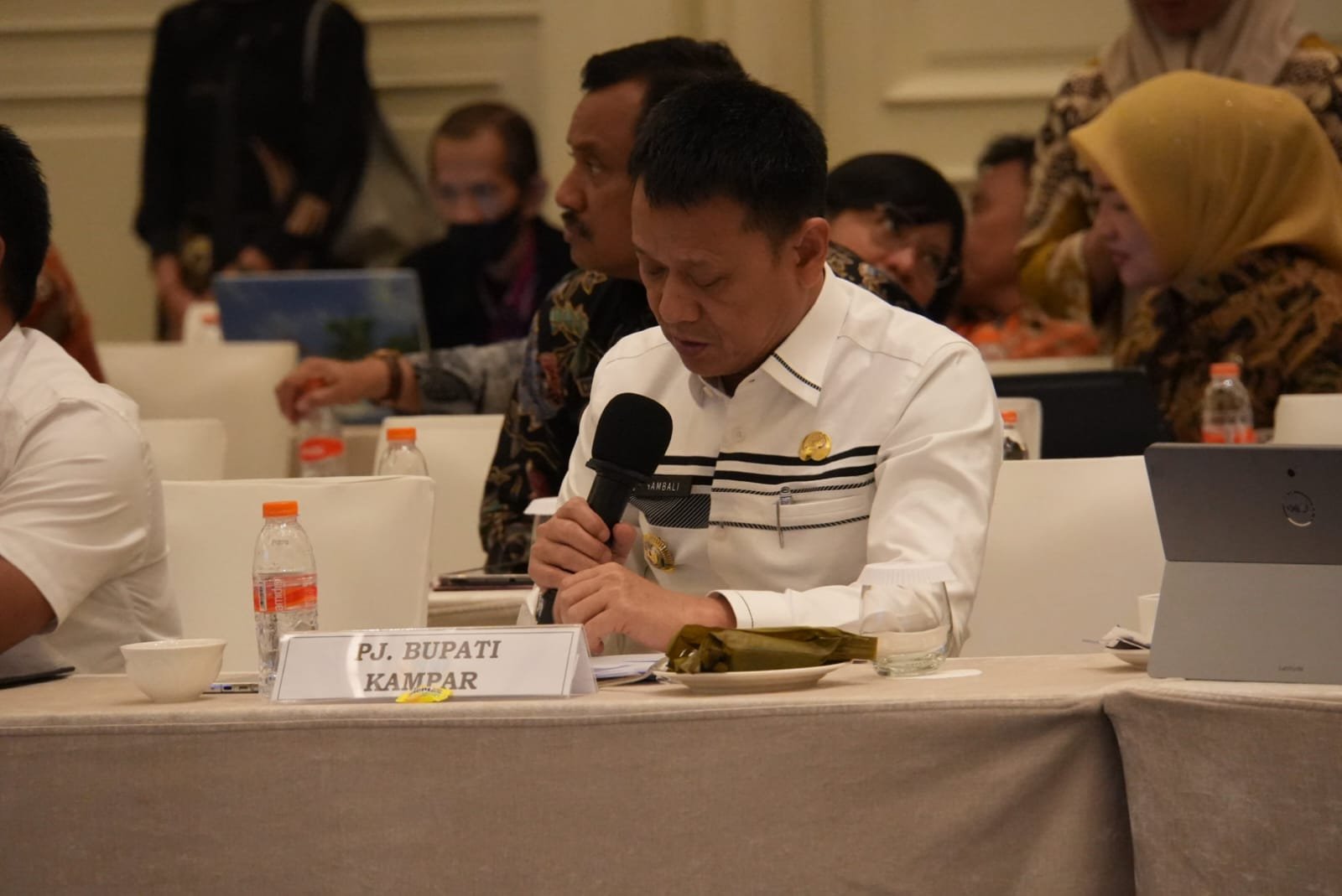 Turut hadir pada kesempatan tersebut Pimpinan rapat Dr. Ir. Abdul Kamarzuki, MPM  Jafung Penata Ruang Ahli Utama, Drs. Pelopor, M.Eng.Sc , Direktur Binda 1, Ir. Sufrijadi, MA Jafung Penata Ruang Ahli Utama, 15 orang Bupati/Walikota dari Kabupaten kota di Indonesia. (Romi/Diskominfo)