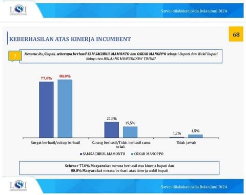 BOLTIM, TI – Lembaga Survei Indonesia (LSI) melaksanakan survei terhadap kepuasan masyarakat atas kinerja Bupati dan Wakil Bupati Bolaang Mongondow Timur (Boltim).