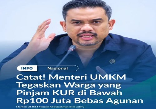 JAKARTA, TI – Menteri Usaha Mikro Kecil dan Menengah (UMKM) Maman Abdurrahman menegaskan bahwa Kredit Usaha Rakyat (KUR) dengan plafon hingga Rp100 juta tidak memerlukan agunan.
