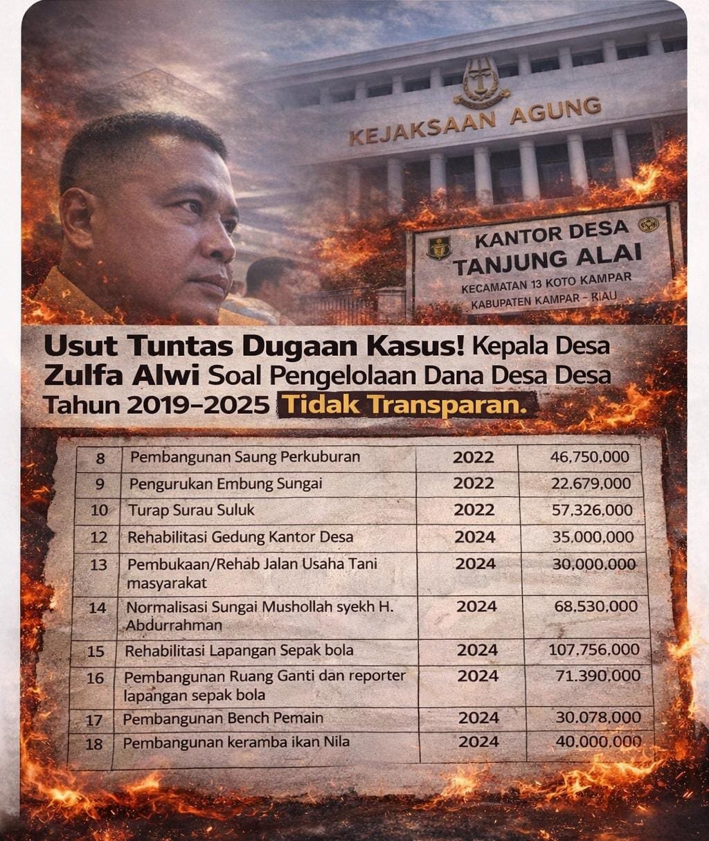 Kampar, Transparansiindonesia.co.id Masyarakat Desa Tanjung Alai, Kecamatan XIII Koto Kampar Kabupaten Kampar, Riau, menyoroti kepemimpinan Kepala Desa Zulfan Alwi terkait dugaan ketidaktransparanan dalam pengelolaan dana desa selama beberapa tahun terakhir.
